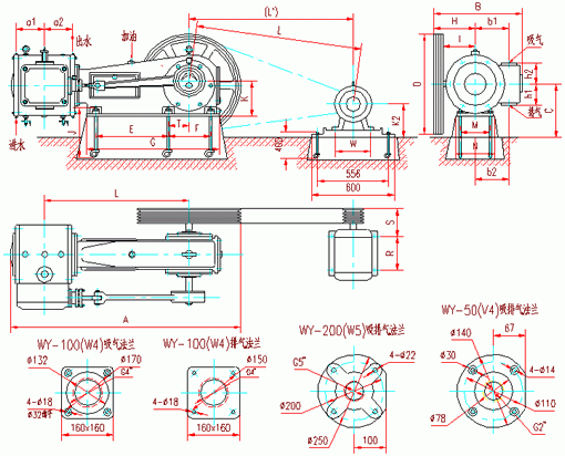 WY-50(V5)、WY-100(W4)、WY-200(W5)往複式真空(kōng)泵安裝尺寸(cun)圖: